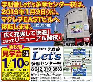 2010年に開校した学朋舎Let’s多摩センター校は、地域の皆様の厚いご支持をいただき、今年で9年目に入りました。 少子化の中、Let’sを選んで頂き、多くの子どもたちに通塾してもらえることは大変うれしく光栄な事で皆様には深く感謝申し上げます。